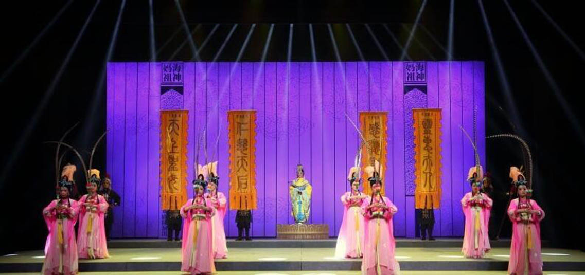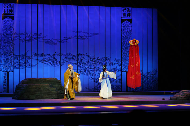 莆仙戲《海神媽祖》主要描述的是林默娘痛心海難無情而無私救苦救難,深得上天感動(dòng),最終被授予遇災(zāi)警示及造福于民的法力,從平凡漁家女子到海上女神的傳奇。劇目以敘事詩般的藝術(shù)手法刻畫出媽祖娘娘扶危濟(jì)困的偉大形象,靈活展示了媽祖娘娘德、行善、大愛”的精神。隨著海上貿(mào)易和文化交流的延伸,媽祖信俗從沿海各地傳播到東南亞乃至全世界,媽祖也因此成為了“海上絲綢之路保護(hù)神”。