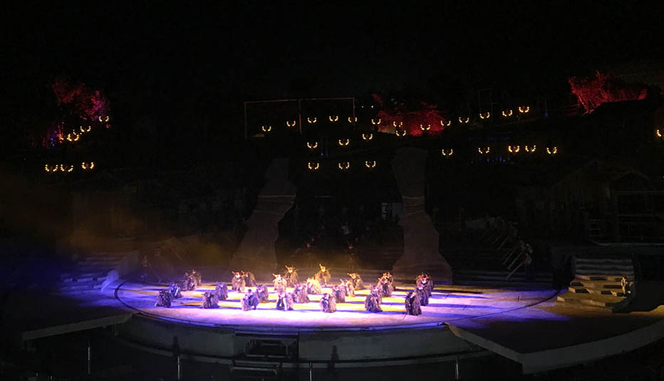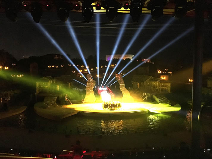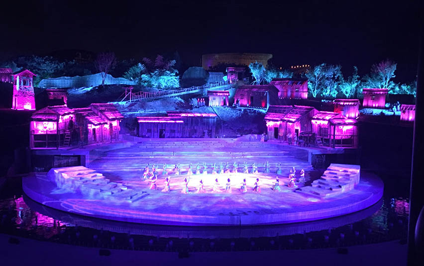 《阿惹妞》作為一部風(fēng)情實(shí)景劇,演出舞臺全部為戶外實(shí)景,既有遠(yuǎn)山又有流水,場景宏大,因此對舞臺景物布光要求很高,不僅要使景物光線分布均勻且達(dá)到足夠的亮度,對燈光的層次性要求也非常高,既要保證遠(yuǎn)方山峰的輪廓清晰可見,又要讓觀眾看得清舞臺中區(qū)演員的表演。G12 HYBRID 能夠做到大范圍均勻鋪光,且具有超高光通量,發(fā)光效率高的同時具備遠(yuǎn)距離照射的能力,在保證遠(yuǎn)景和中景清晰的前提下,運(yùn)用G12 HYBRID亮度變化,配合現(xiàn)場光焰等特效,能夠制造出極具擴(kuò)張感的震撼視覺效果。
