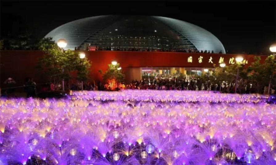 晚會當(dāng)晚,國家大劇院殼體、水面,及周邊建筑被集體打亮,其場面宏大、氣勢非凡。國家大劇院在三種顏色的基礎(chǔ)上,增加至8種燈光顏色循環(huán)變換,北門處增加了“花?!睙艄庋b飾效果,呈現(xiàn)燈光璀璨的壯觀場面。