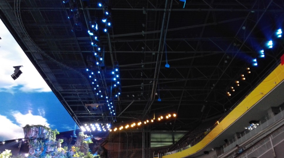 為更真實的反應(yīng)恐龍世界的自然環(huán)境,《遠去的恐龍》將6000㎡高清LED巨幕組成舞臺的環(huán)幕背景和天空穹頂,這一創(chuàng)作突破了舞臺空間的枷鎖,在國家體育館這一密閉場館內(nèi),開辟了恐龍世界深遠無際的遠景和天空。而在觀眾席以外的場館空間,《遠去的恐龍》構(gòu)建了表面積達11000㎡巨大的高度仿生的山、水、林木實體場景,將恐龍世界的地容、地貌完美地搬進了國家體育館。