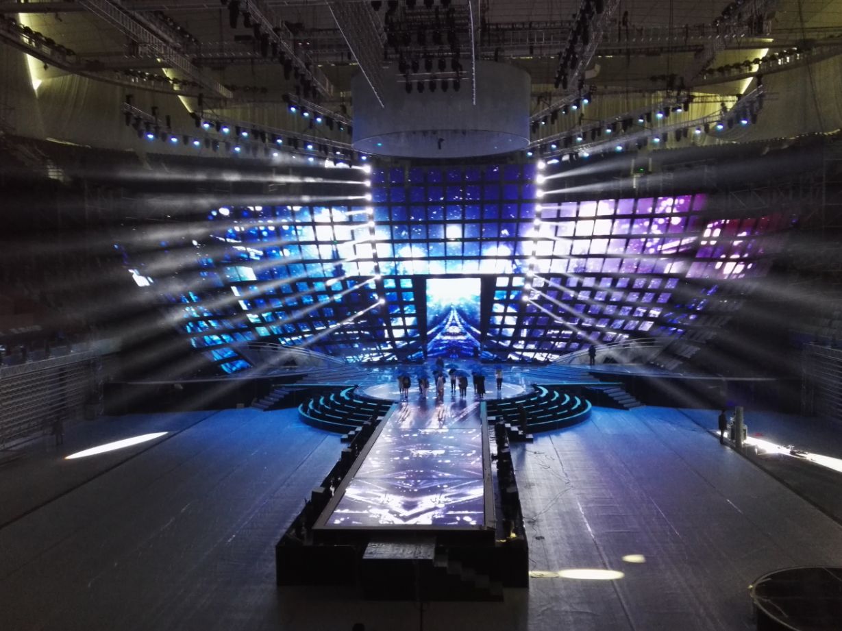 追求新亮點的江蘇衛(wèi)視今年刷新了演唱會舞臺:四面臺升級為360度全景巨型圓舞臺,給觀眾帶來前所未有的視覺沖擊;機械燈臂組成變形空間站,天幕地屏配合猶如浩瀚宇宙。根據(jù)比利時的燈光設計師Ignace介紹,去年所有構造和場景都是為扁長型舞臺而設計,今年所有設計都是為了讓觀眾感受到前所未有的一種“沉浸感”,“(每一個區(qū)域)觀眾到舞臺距離一致,這和去年有很大的不同,觀眾的感受獨具一格,是宇宙的感覺。”