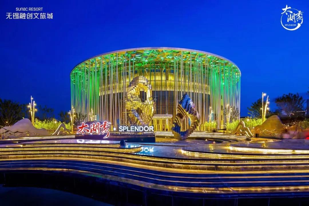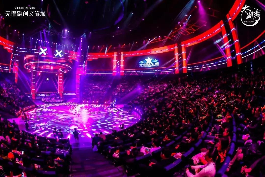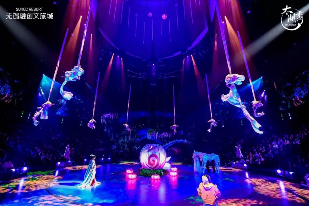 太湖秀劇場的創(chuàng)作靈感來自于江南特色的“竹林”,外圍是365根層疊錯落的仿竹鋼立柱,屋頂使用不規(guī)則的三角形金屬百葉板進行裝飾。3萬平米的劇場內(nèi),直徑16米的主舞臺可實現(xiàn)360°旋轉(zhuǎn)、2米升降和10°傾斜,空中1800㎡的360°環(huán)形LED大屏嚴絲合縫,配合11臺高速布景吊機、22個高速雜技卷揚機、500多個高空舞美吊點打造沉浸式的視覺盛宴,此外還有先進的高空3D噴泉和舞臺水處理系統(tǒng),可以實現(xiàn)干舞臺和水舞臺的快速切換。